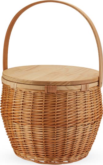 - Includes: Woven basket with wood lid and insulated lining that zips closed