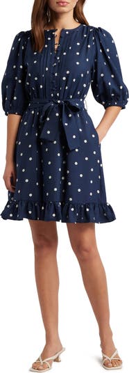 Darling puff sleeves charm this crisp day-to-night frock shaped by a tie belt and punctuated with a swingy frilled hem.