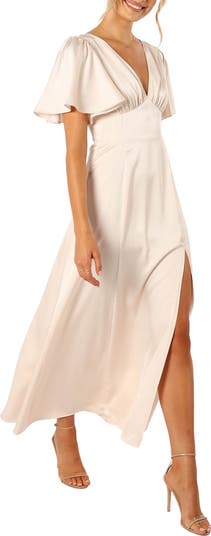 Elegant flutter sleeves add to the glamour of this flowy satin dress with back smocking.