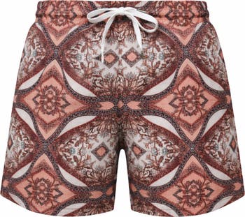 The Caspian swim trunks feature a timeless Tuscan print designed to complement the Coral bikini for a sophisticated matching look. Engineered for all-day comfort, these trunks offer a custom fit with an elastic waistband and adjustable drawstrings, while the mesh interior and practical pockets make them a versatile beach essential