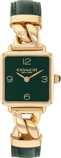Full of modern, distinctive style, this square-face watch features a clean dial detailed with numeral markers. Golden links flank the leather strap for an extra element of shine.