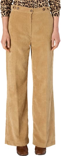 Wide-leg silhouette with subtle ribbed texture, tailored front crease and buttoned waist, offering a sleek, comfortable foundation for city weekends and relaxed office days.