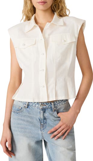 Crisp pleats add structure to this lightweight linen-blend top lined with faux-pearl buttons that refine the look, while padded cap sleeves bring definition to the shoulders for a confident finish.