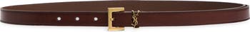A brushed-finish buckle and house-signature monogram hardware glint at the front of this Italian-crafted belt made from smooth leather.