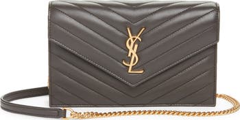 Antiqued monogram hardware beautifully pops against the chevron-quilted lambskin of this sleek wallet that's slung on a chain-and-leather strap for hands-free convenience.