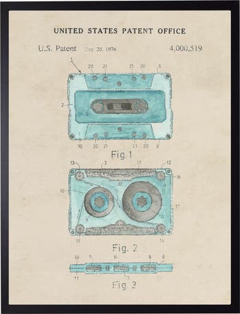 This vintage-inspired print, framed in a black wooden frame, features a cassette tape patent. Sized at 16 inches by 20 inches, this made in the USA frame makes for a beautiful addition to any wall.
