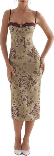 This sculpting corseted midi is designed in enchanting blooms with slinky adjustable straps and lacy trim.