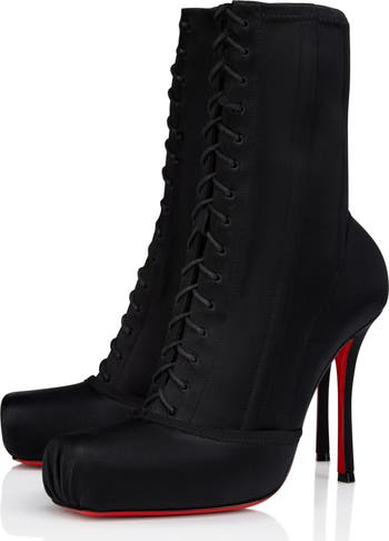 A satin overlay with gathers at the square toe brings ballet-core energy to this lace-up bootie elevated on a lofty stiletto heel. The iconic Loubi sole originally born from a brush with fiery-red nail lacquer adds a signature finish.
