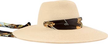 A satin pull-through scarf adds an elevated aesthetic to a wide-brim fedora that's easily packed away during your travels.