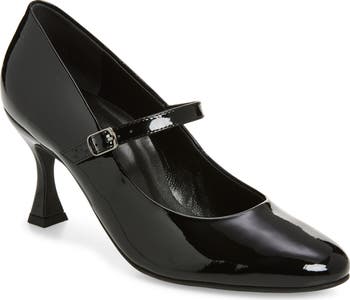 An adjustable mary jane strap offers a secure fit and retro aesthetic on a streamlined leather pump set on a cushioned footbed and svelte flare heel.