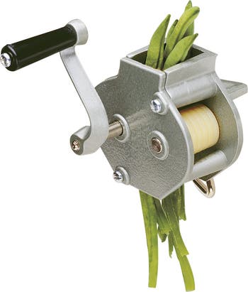 - Cast aluminum bean slicer quickly cuts green beans into uniform strips