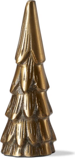 - Cast Aluminum Holiday Tree Decor made from high-quality aluminum with an antique brass gold finish measuring 6 inches high, 2 inches long, and 2 inches wide, perfect for Christmas decor and decorative objects.