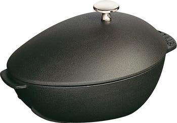 Made from premium enameled cast iron, this mussel-shaped pot is ideal for cooking one or two pounds of shellfish on the stovetop or in the oven.
