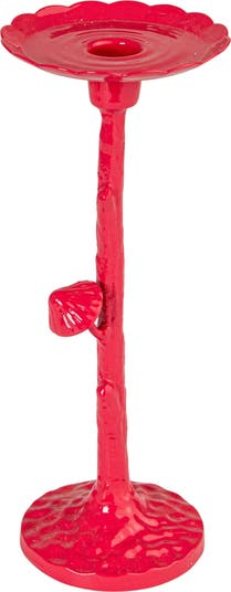This enchanting candle holder is crafted from cast metal and showcases a delightful twig and mushroom design in a striking fuchsia hue. Measuring 3.75 inches in diameter and 10 inches in height, it is perfect for holding 3-inch pillar or standard taper candles. Its whimsical aesthetic makes it an ideal piece for cottagecore, garden, French country, or farmhouse decor, adding a touch of charm and warmth to any space. This candle holder's intricate detailing and vibrant color will surely make it a standout piece in any room. Its sturdy construction ensures durability, while its unique design adds a touch of nature-inspired elegance to the home decor.