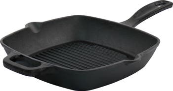 The Oster Castaway 10 Inch Square Cast Iron Grill Pan with Pouring Spouts is a must have addition for any home kitchen cookware setup. Features grilling grooves for creating more texture with in food to better hold seasonings. Built-in dual spouts make it perfect for pouring juices and sauces. For proper long lasting care, hand wash only and dry towel dry immediately. This pan's cast iron body is ideal for searing beef, bbq chicken or roasting lamb.