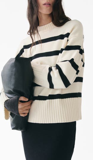 Channel classic nautical style in this relaxed-fit crewneck sweater detailed with timeless stripes and ribbed trim. It's knit from cushy wool-kissed yarn to keep you warm on chilly days.