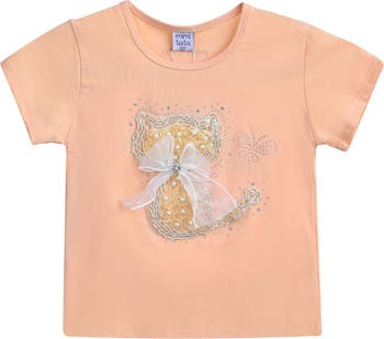 The Cat Applique T-Shirt is a delightful addition to everyone's wardrobe. Crafted in a soft cotton material, this t-shirt features an adorable cat applique that adds a touch of playful charm. The round neck ensures a comfortable and classic fit, while the short puff shoulders provide a charming and girly touch. The straight hem offers a neat and simple finish, making this t-shirt versatile and easy to pair with various outfits.