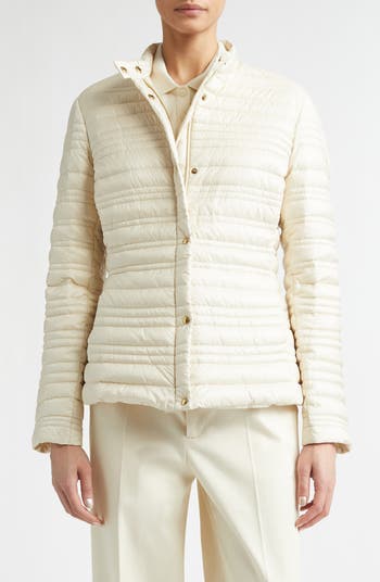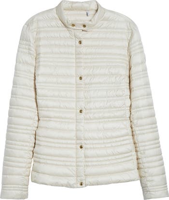This stripe-quilted puffer reimagines the iconic biker jacket through a Moncler lens, pairing classic moto details like a low stand collar and snaps with a contemporary interpretation of boudin quilting.