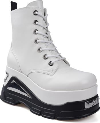 Bring bold biker edginess to your footwear collection with this heavy-duty combat boot set upon a chunky platform sole gleaming with logo-emblazoned plaque hardware.