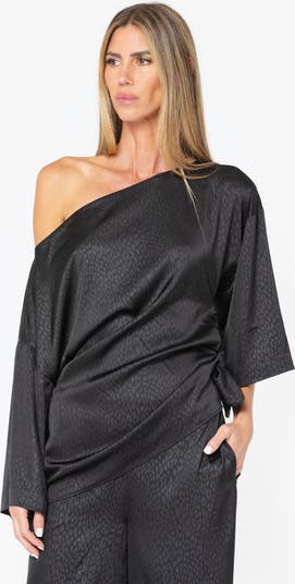 The Cataleya Top is a statement piece designed with a luxurious satin finish and a subtle embossed leopard print, adding both depth and texture to the fabric. Featuring a chic, asymmetrical neckline, it can be styled off one shoulder for an effortlessly elegant look. The relaxed silhouette is complemented by wide, draped sleeves that enhance its fluid movement. A side tie detail at the waist allows for a flattering, adjustable fit.