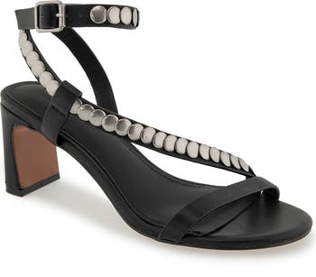 Polished discs form an asymmetric stream across the foot and around the ankle on this edgy leather sandal set on a slim block heel.
