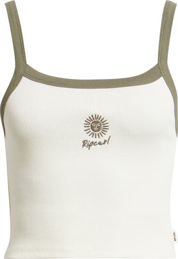 An embroidered motif makes a sunny statement on a cropped baby tank knit in a soft stretch-cotton rib.
