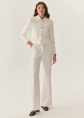 - The Classic High-Waist Pants in white offers a polished, versatile look. The fluid fabric gives it an easy drape. It styles easily with shirts, knits, or simple tops for both casual and polished dressing.