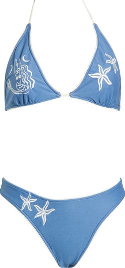 An ultracool denim-like fabric and a tropical graphics enhance the breezy, vacation-ready vibe of these bikini bottoms with high-cut legs.