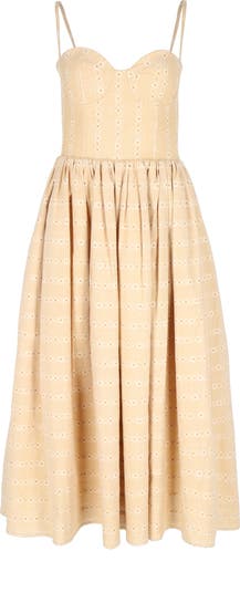Midi dress with a corset bodice, and adjustable spaghetti straps. Features a gathered skirt and smocking at the back