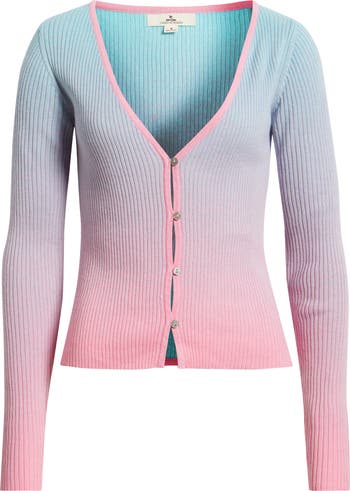A cotton candy ombré design brings whimsical color and style to a soft rib cardigan with shiny buttons at the front.