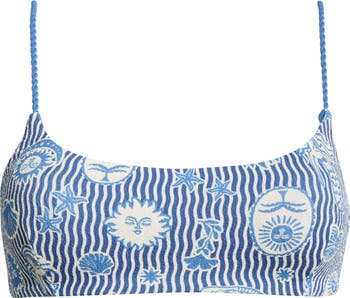 Imagery of sun and surf adds to the beachy vibe of this stretchy bikini top suspended by ropy straps.