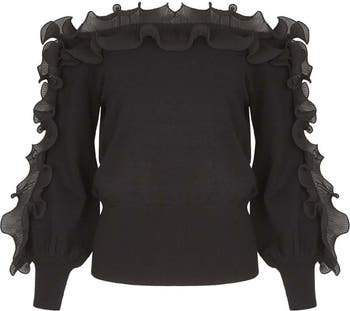 The CATANE is an off the shoulder luxury knit cardigan. Along the front and down the arms are adorned with micro pleated vertical ruffles. The bottom hem and cuffs have a rib finish.