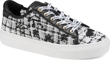 Logo-printed laces and embroidery bring signature style to a tweed-inspired sneaker cushioned for comfort.