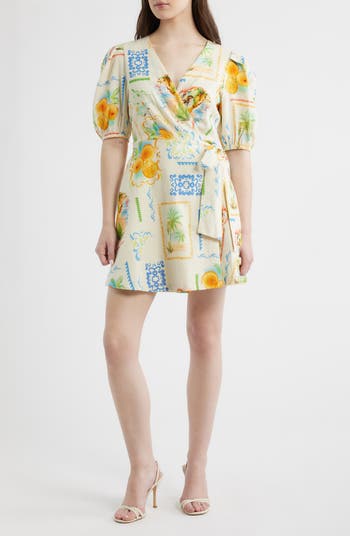 Caterina Postcard Print Linen & Cotton Wrap Minidress