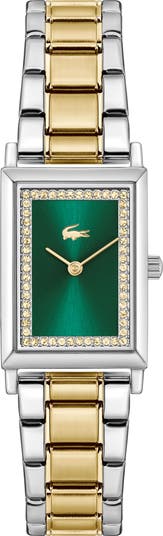 A minimalist dial framed with a rhinestone halo enhances the supersleek look of this stainless steel watch.