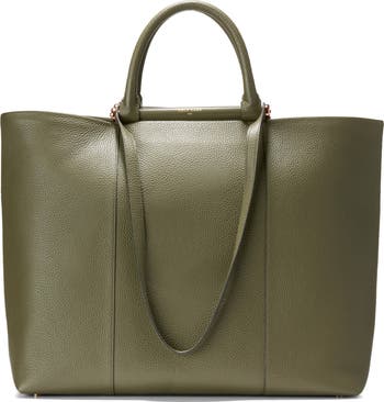 Wrapped-bar hardware adds a subtle glint against the grained leather of this roomy tote designed with multiple compartments and a pair of top handles and shoulder straps for on-the-go convenience.
