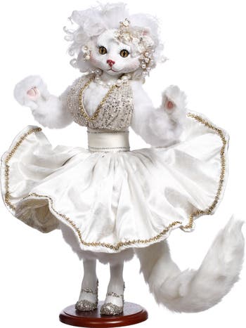 The Catherine Monroe 24.5" figurine by Mark Roberts is an elegant, couture-inspired collectible featuring a graceful white cat posed like a classic stage performer. Dressed in a flowing white gown with gold trim, delicate florals, and jeweled accents, it showcases the brand’s signature attention to fine fabrics and hand-finished details. Standing 24.5 inches tall on a display base, it’s designed as a statement piece for sophisticated holiday or year-round décor.