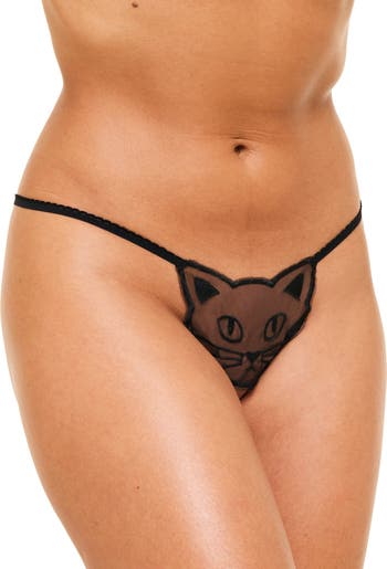 The crotchless g-string features a playful mesh and embroidered cat face to cover your kitty.