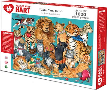 American curl, Siamese, Burmese, tabby, lions and tigers. All your favorite breeds and felines brought to life with Sherri’s unique illustration style that brings so much character to our best friends. Look for your favorite in this 24”x 30” 1000 piece puzzle. By artist Sherri Buck Baldwin. You will have hours of enjoyment putting this puzzle of cute cats and kitties together. We pride ourselves on our high quality puzzles containing the finest art, photography and graphics. Hart puzzles also has a mission to help better our communities. When you purchase a Hart Puzzle, you become a "piece" in our cause to help. With every puzzle we sell, Hart Puzzles automatically donates to a cause such as our National Parks, animal shelters and veterans.