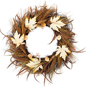 The muted tones of autumn glow in this 24" feathery fall wreath featuring a combination of grasses, wheat and delicate seedheads, accented by a scattering of cream-colored maple leaves and wood curl flowers. The delicate arrangement is mounted to a natural grapevine twig wreath base for easy hanging. This understated fall accent is a beautiful way to greet autumn and celebrate the harvest season. Product Features: No assembly required - wreath comes in 1 piece Natural grapevine twig base with loop easy hanging Recommended for indoor use - if using outdoors place under a covered area Dimensions: 24" diameter (measured from outermost edge to outermost edge across the wreath) Inner ring dimensions: 8" diameter Material(s): grapevine/plastic/polyester/foam