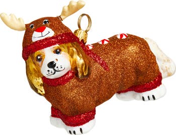Joy to the World Collectibles Cavalier King Blenheim in Reindeer Pajamas Glass Ornament, Main, color, Brown