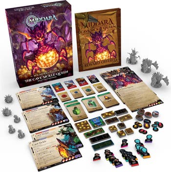 MIDDARA: CAVE SICKLE QUEEN BOUNTY PACK - EXPANSION - Hunger in the Deep! Through the twisting caverns and winding tunnels, a monstrous matriarch reigns supreme over her chittering brood...The Cave Sickle Queen Bounty Pack offers a Mundane level bounty where adventurers will explore a vast network of underground caverns, battling through the swarm of Cave Sickles to reach the heart of the hive and confront the formidable Cave Sickle Queen. NEW VARIATIONS: This Bounty Pack introduces exciting new variations of Cave Sickles that will challenge players to adapt their strategies and develop new tactics. NEW ACCESSORIES: The Cave Sickle Queen Bounty Pack new miniatures, tokens, and loot that bring the terrifying ecology of this iconic Middaran monster to life. HOW DO YOU USE The Cave Sickle Queen Bounty Pack? During Story Rounds in the Unintentional Malum Adventure, you’ll be given the option to “attempt a (skull) Bounty”. The Cave Sickle Queen is a Mundane (1 skull) Bounty, so if the Story Round tells you to “Attempt a (1 skull) Bounty as an option, you will be able to play it there. It can also be played as a standalone expansion using the Build Guides in the beginning of the Bounty Book. EXPANSION: The Cave Sickle Queen is a Bounty Pack Expansion for Middara Unintentional Malum: Act 1 (Ver 1.2) and cannot be used without that product. INCLUDES: (1) Bounty Book, (8) Miniatures, (107) Cards, (70) Tokens, (18) Standups, (5) Base Rings.
