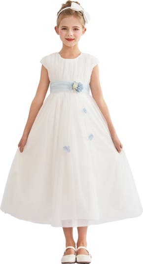 A graceful full‑length gown with a sheer skirt, a sash, and delicate floral accents for an elegant finish. Charming Details: Pleated bodice, round neckline, and scattered floral embellishments. Occasion Perfect: Ideal for weddings, communions, or formal celebrations.