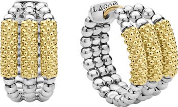 Triple layered huggie hoop earrings shine in two tones boasting 18-karat gold center bars and signature Caviar beads.