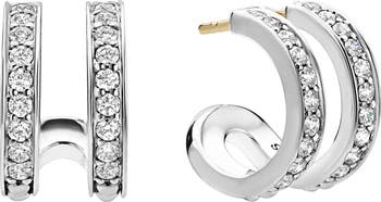 Lines of pavé diamonds stream side by side and transition into signature Caviar beading on these double sterling silver hoop earrings.