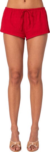Eyelet embroidery adds a delightful detail to these ultrashort shorts in a lightweight cotton weave.