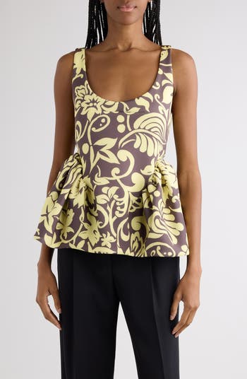 An allover print of tropical flora speaks to the Belgian brand's affinity for all things bold and blooming on this sculptural scuba-knit top from Van Noten successor Julian Klausner's spring '26 celebration of surf culture.