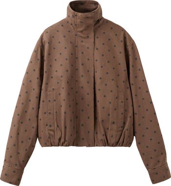 Be sweetly spotted in an upscaled denim jacket cut in a bomber silhouette and offered in an earthy hue.