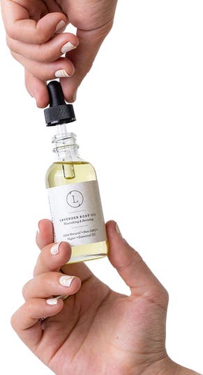 - Lavender body oil in a glass bottle with pipette dropper tip - 2 oz