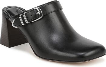 A gleaming buckle strap brings polished edge to this leather mule set on a tapered block heel that delivers confident lift with modern structure.